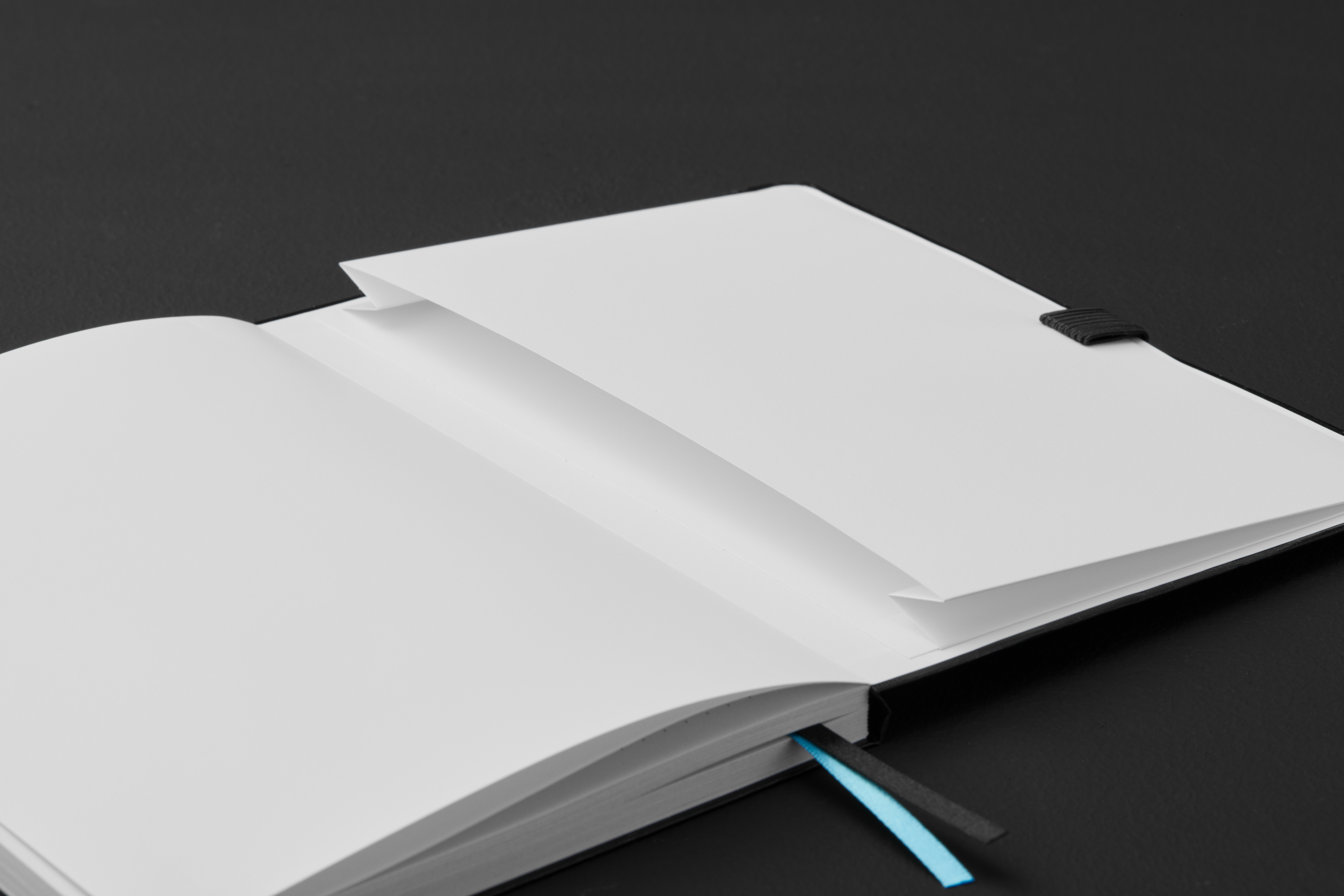Contine opt pagini detasabile, doua panglici cu semne de carte din material textil, un buzunar pe coperta interioară din spate, o banda elastica si suport pentru LAMY safari all black ncode.