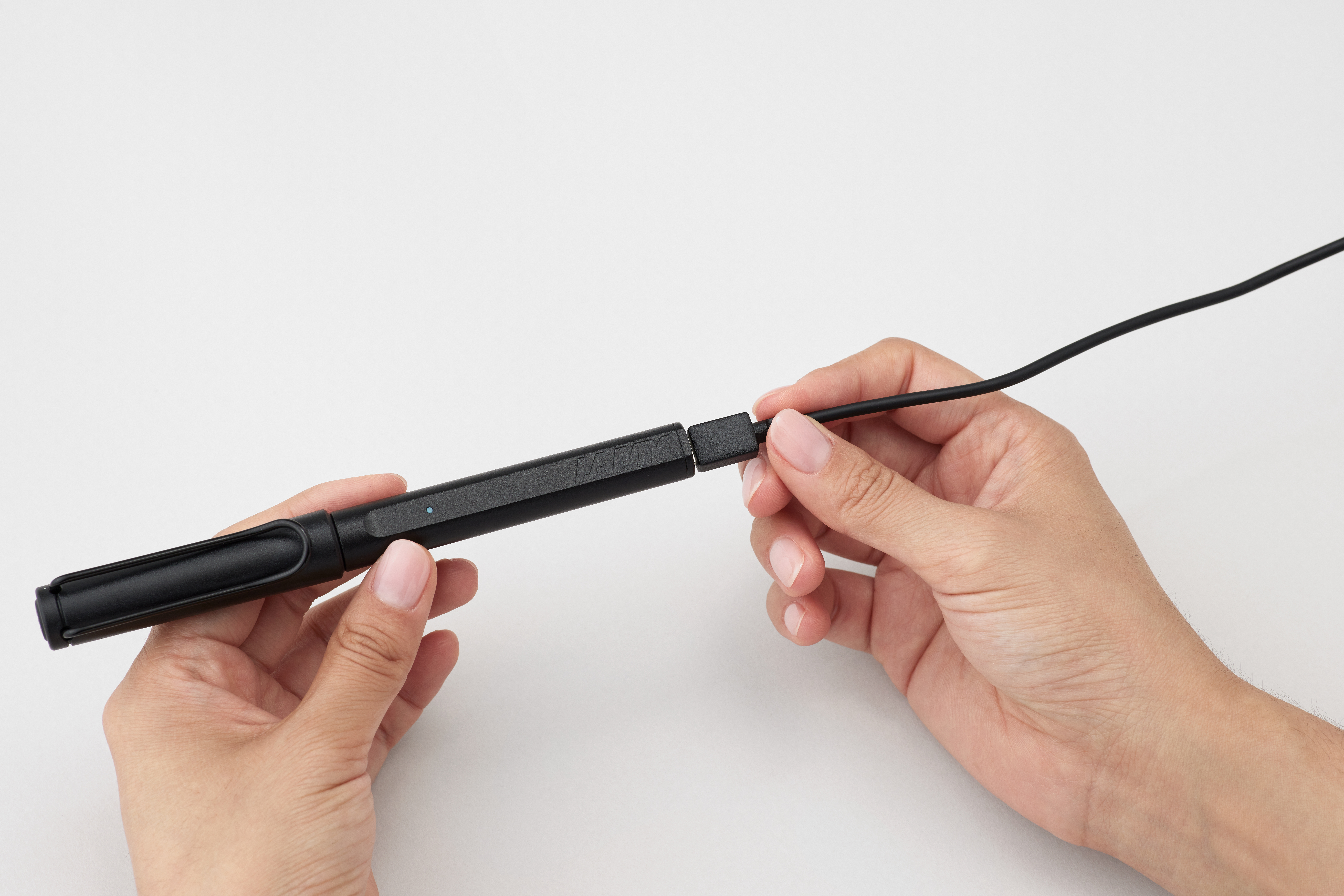 Setul contine pixul inteligent LAMY safari all black ncode, cablul de incarcare USB si notebook-ul digital LAMY